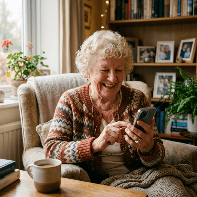 Antonio, 72 años. Sus nietos viven en otra ciudad. Antes dependía de que su hijo le configurara el teléfono cada vez. Ahora inicia la videollamada solo, usando el asistente de voz. 'Solo digo: llama a Lucía y ya está.'